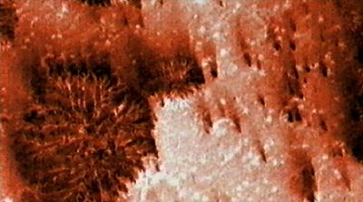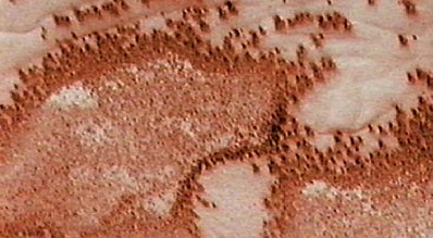 THE SMITHSONIAN WAS SHOWN THE MOST EXTRAORDINARY PHOTOS EVER TAKEN OF THE RED PLANET. THEY SHOW CLUSTERS OF BRANCHED SHAPES UP TO 800 FEET ACROSS AND 80 FEET HIGH, RISING FROM THE SUMMER MELT ZONE OF THE MARTIAN SOUTH POLE.